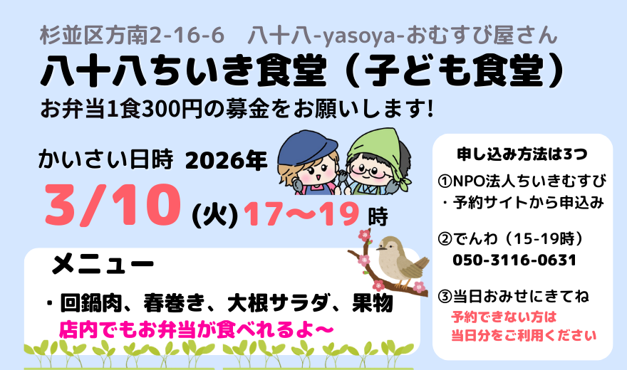 沢山の方にお申込みいただき、ご予約が取りづらくなっています。初めて八十八ちいき食堂を利用する方向けに優先枠を設けております。※アレルギー対応はしておりません。※内容は変更になる場合があります。