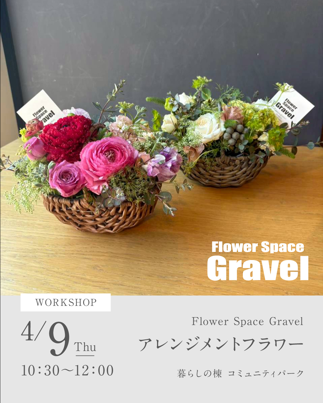 Flower Space Gravelによるワークショップ 今回は母の日にもおすすめの アレンジメントフラワーレッスンを開催いたします。 ナチュラルなバスケットを使用したアレンジメントです。 自分用にも贈りものにも大変おすすめです。 皆様のご参加をお待ちしております。 ※当日の花材の入荷状況により花付きのサイズに変動がございます。 ※画像はイメージです。 ※切ばさみをお持ちの方はご持参ください 【caffe vanillaのドリンクチケット付き】 ホットコーヒー・シナモンナッツミルクティーのどちらかをお選びいただけます。 (※シナモンナッツミルクティーはシナモン抜きやナッツ抜きも可能です。)